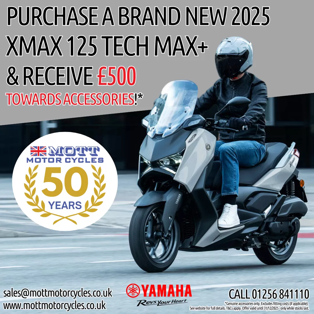 Get up to £600* to spend on official Yamaha accessories for your new NMAX 125 Tech MAX, XMAX 125 Tech MAX+ or XMAX 300 Tech MAX+ and take your new scooter to the MAXimum.